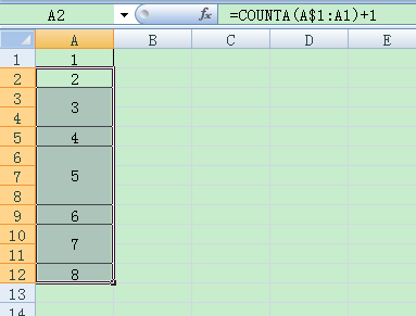 在编辑栏直接输入公式=counta(A$1:A1)+1,然后按Ctrl +Enter,结果就跑出来了。
