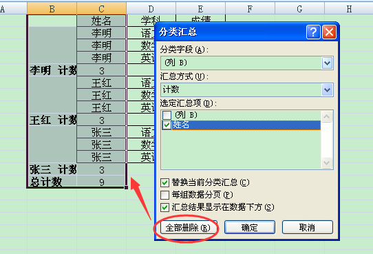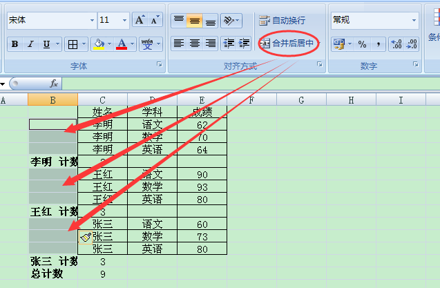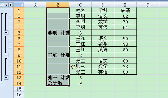 空值定位之后,进行合并单元格,然后我们选定B2:C14,并对其再使用分类汇总》全部删除;