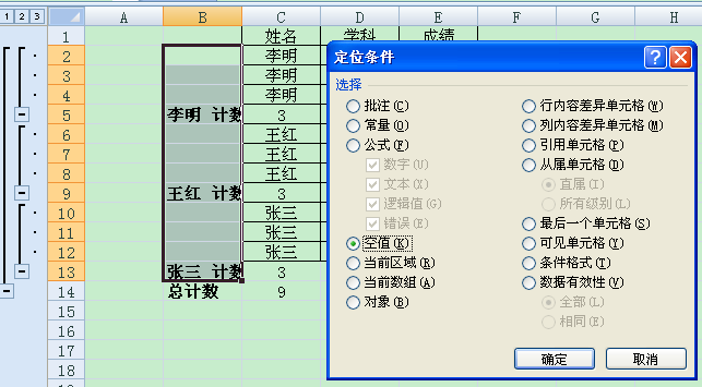 选中B2:B13,然后按住CTRL+G进行定位空值,我们得到下面结果;