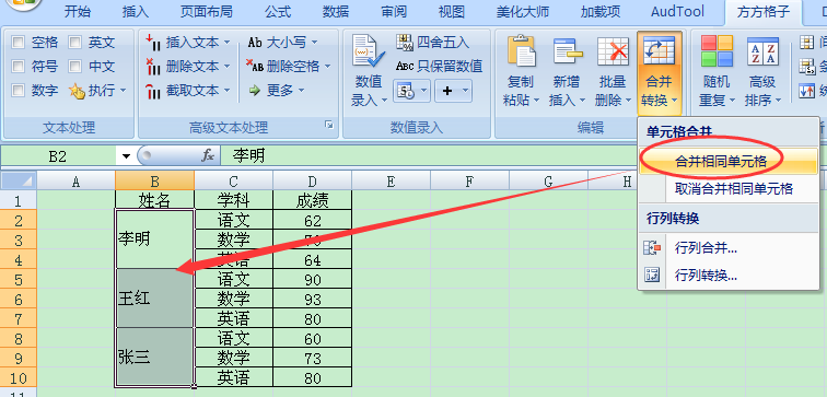 选中B2:B10,然后点开方方格子》合并转换》合并相同单元格,一步就搞定了,比起第一个方案,效率简直不谈了......