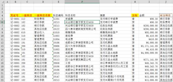 客户提供给我们序时账和科目余额表,在是筛选某个科目的所有凭证的时候,不能显示完整的借贷关系分录,后者我们细节测试想看某个科目的对方科目是否异常,测试计提与分配,等等都需要看到对方科目。这时候我们可以将对方科目放在同一行,方便筛选和统计。
