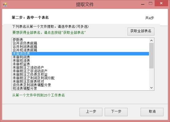 第二步,程序会获取我们选择文件夹中所有工作簿中工作表的名称,然后我们选择要提取的工作表名称,比如我选择的是“未审资负表”,点击【下一步】。