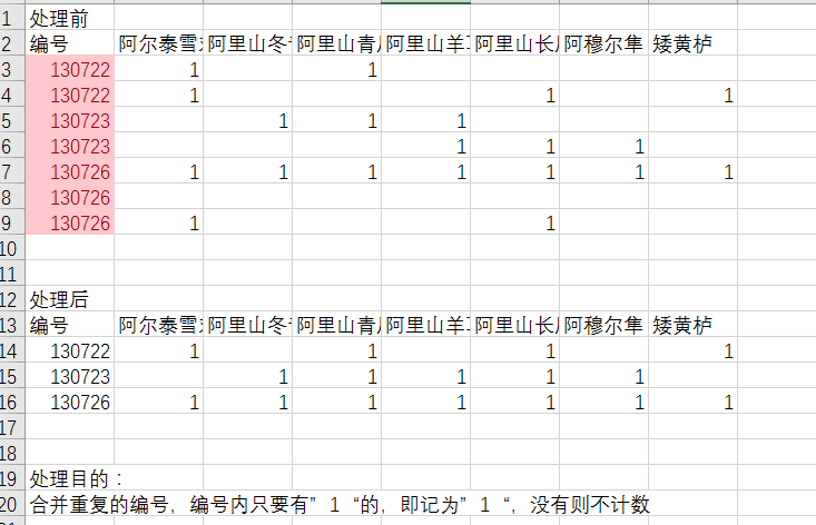 对大量数据进行整理,达到如下目的:合并重复的编号,编号内只要有”1“的,即记为”1“,没有则不计数,如图所示。谢谢!