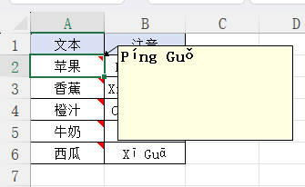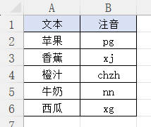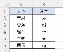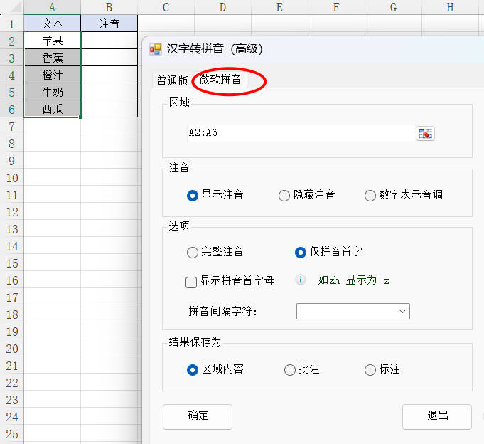 1.选择功能的第二个选项卡 微软拼音,区域选择A2:A6,显示注音,仅拼音首字母,拼音间隔字符设为空,结果保存为区域内容,然后点击确定按钮