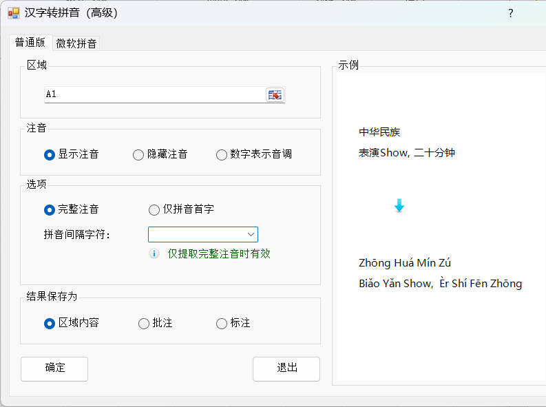 汉字转拼音(高级)功能,支持普通拼音(如搜狗、百度)和微软拼音(zh/ch/sh 按完整声母识别)。注音方式可以选择显示注音、隐藏注音、数字表示音调,结果保存的形式支持保存为区域内容、批注或标注。
