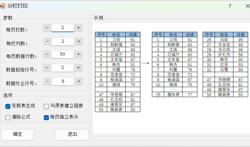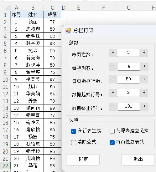 2.设置每页栏数3,每栏列数4,每页数据行数50,数据起始行号2,终止行号181,勾选在新表生成,每页独立表头。然后点击确定按钮