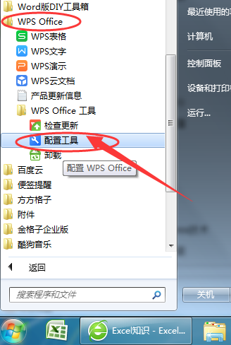2. 进入开始菜单-》 所有程序-》 找到WPS Office -》点击展开,并运行“配置工具”,如下图: