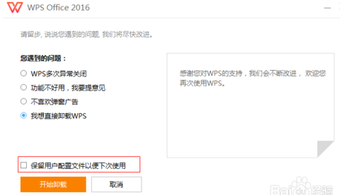 如果已经恢复正常,则不需要卸载WPS。若要卸载,卸载时一定要取消勾选 “保留用户配置文档..”,如下图: