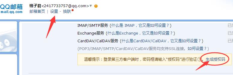 (登陆邮箱 -》 设置-》 账户,即可找到申请授权码的位置 )