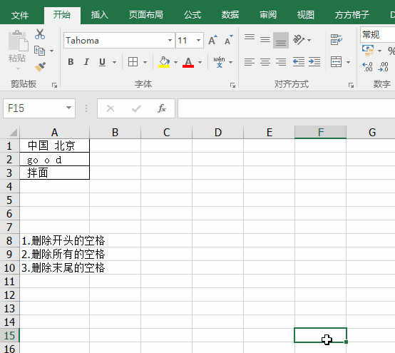 今天我介绍一个简单高效的办法,借助方方格子中删除空格的功能,我们轻松删除不同情况下的空格,请看动画: