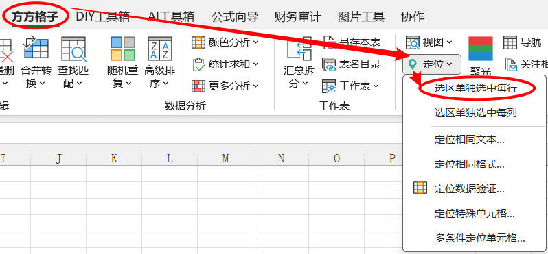 2.点击方方格子> 视图 >定位>选区单独选中每行