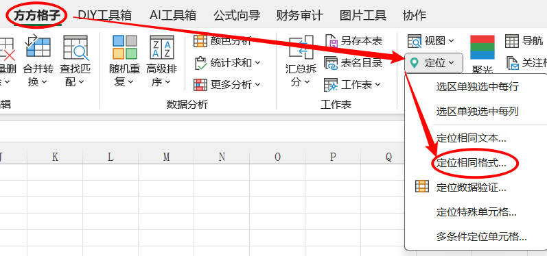 2.点击方方格子> 视图 >定位>定位相同格式...