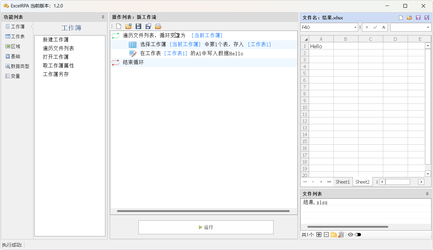 2.工作簿模式:选择要处理的工作簿,对每个工作簿执行,右侧的操作流程。用户需要自己通过打开文件的操作,来对工作簿的对象进行进一步处理。