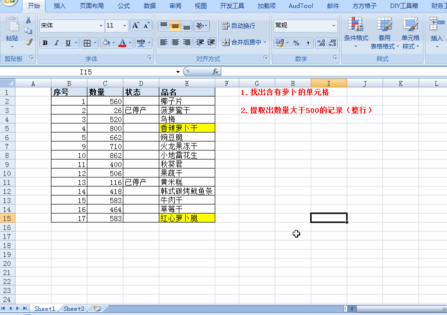 2.演示:提取出数量大于500的记录(整行):