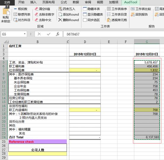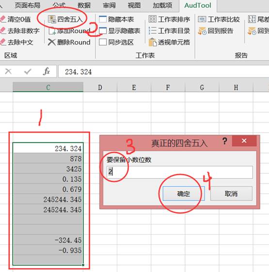 在编制底稿、报表、和附注的时候经常需要统一保留小数,但是excel自带的功能只能设置显示的小数,但是更多的小数位只是被隐藏了,导致计算报表结果经常出现尾差。该四舍五入功能可以将其直接转换成想要的小数位数的值。