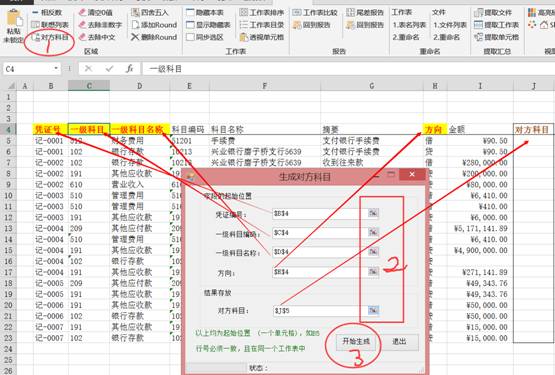 点击【对方科目】-在弹出窗口中选择四个关键字段“凭证号”“一级科目编码”“一级科目名称”“方向”,然后选择生成对方科目的存放位置,注意,一定要存放在第一笔凭证的起始行的某一列,如图示。