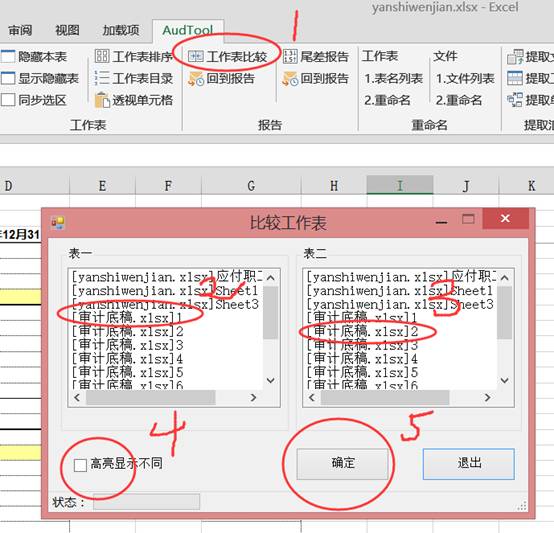 点击【工作表比较】-弹出窗口列示了所有打开的工作簿中工作表的列表,左右两列一样,只是用了过来作为比较表和被比较表,分别作为表一和表二,如果勾选【高亮显示不同】,则不单在比较报告中列示差异,还在比较表和被比较表源表中高亮不同的区域。
