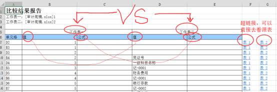 点击【比较结果报告】的最右超链接可以追溯到被比较表和比较表的相关单元格,点击【回到报告】快速返回到比较报告中。