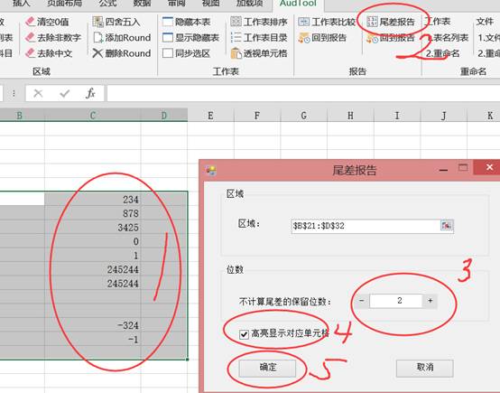 选中(也可以后选)要检查的区域,点击【尾差报告】-点击选择要【不计算尾差的保留位数】-可以勾选【高亮显示对应单元格】可以对检查区域有尾差的进行高亮显示,点击【确定】,生成报告
