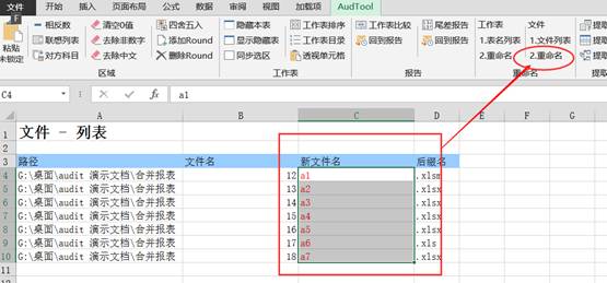 上一步完成后生成文件列表,并且可以看到文件格式,收入“新文件名”,点击【2.重命名】