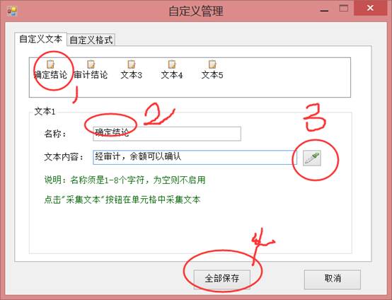 有时候审计底稿的结论是固定的,每次都手打重复又浪费时间;同样输入某些符号(如:√)每次都很难找,同样每次对底稿设置常用的数字格式,以及边框,背景色,等都重复又麻烦。有了自定义管理就可以提取我们常用的文本,符号,格式保存下来,每次点击一下批量完成我们需要的文本,符号,格式。