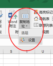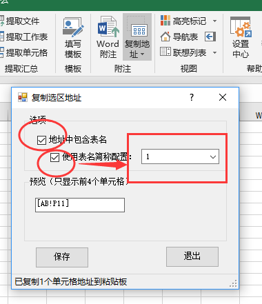 因为excel附注表格的单元格地址随着所在表名字的长度而增长,导致复制到word中的excel单元格地址占用空间大,破坏了word附注表格的排版,因此我们设计了表格名字的简码,点击下图中演示的“复制地址”下箭头位置,即可弹出设置窗口,勾线“使用表名称简称配置”后在下拉框中选择简称方案。